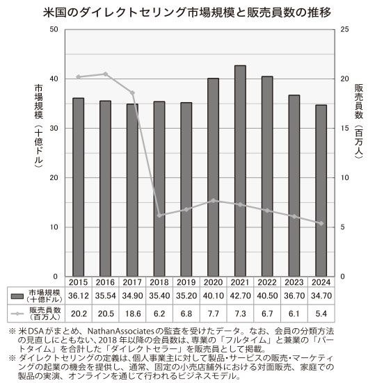 米DSA(ダイレクトセリング協会、ワシントンDC、デイブ・グリマルディCEO)が8月27日までにまとめた、2024年(1月〜12月)の米国のダイレクトセリング市場規模は前年比で5・4%減の347億ドルだった(小売りベース、約5兆2710億円、グラフ参照)。コロナ禍の20〜21年は過去最高額を更新したが、3年連続の減少。15年以降の10年間で最低となった。報酬を得た販売員の数は4年連続の減少だった。なお、市場規模の円換算ベースの前年比は1・6%増。