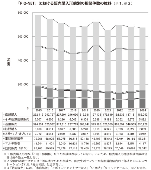 なお、訪問販売に含まれるアポイントメントセールス、SF商法、キャッチセールスを除いた「家庭訪販」としての件数は5万5000件で、前年度比は9・7%増。こちらも2年連続増だった。