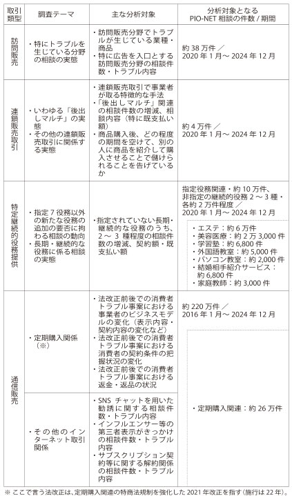 今回の委託事業で調査する取引類型は4つ(表参照)。このうち訪問販売は、20年〜24年の訪販関連のPIOデータ約38万件が分析対象となる。具体的には、トラブルが目立つ業種・商品と、「特に、広告を入口とする訪問販売分野」(仕様書より)の相談件数、トラブル内容を調べるという。