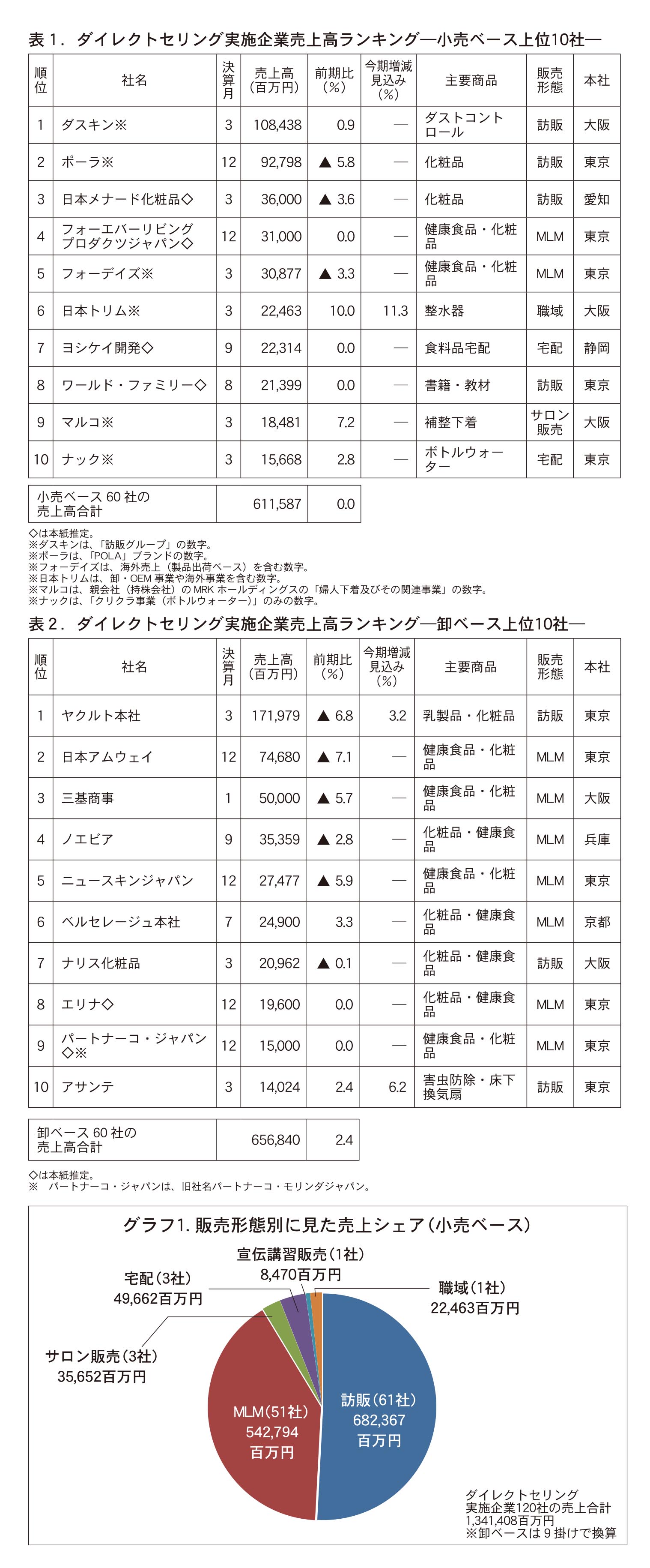 回答企業を販売形態別(グラフ1参照)にみると、訪販が61社、MLMが51社で、2分野で回答企業の9割を占めた。売上ベースでは、訪販が6823億6700万円、MLMが5427億9400万円。小売・卸ベースともに上位の企業ついては表1および2に掲載。小売ベース11位〜59位、卸ベース11位〜60位については2面に表を掲載している。前期で売上増収率が高かった上位10社についても、2面でまとめている。