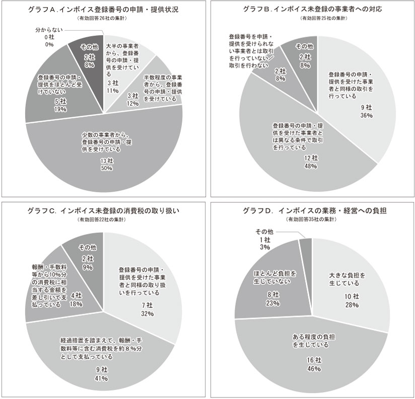 次に、登録番号の申請・提供を受けていない事業者との取引で、どのような対応を取っているか調査(グラフB参照)。集計の結果、「登録番号の申請・提供を受けた事業者とは異なる条件で取引を行っている」(12社)が最多となり、48%を占めた。