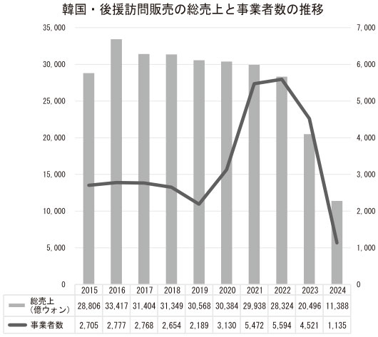 韓国FTCが25年11月19日までにまとめた後援訪問販売事業者の2024年の合計売上は、前年比で44.4%減の1兆1388億ウォン(約1264億円、対面式販売とEC販売の合計)に急減した(グラフ参照)。8年連続の減少。