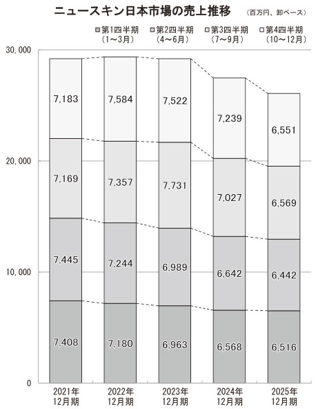 ニュースキン・エンタープライズ(米ユタ州、ライアン・ナピアスキー社長兼CEO)の25年12月期における日本市場(ニュースキンジャパン)の売上高は、前期比で5.1%減の260億8011万円(卸ベース、グラフ参照)だった。減収は3期連続。四半期ベースは第1Qが0.8%減、第2Qが3.0%減、第3Qが9.3%減、第4Qが9.5%減。